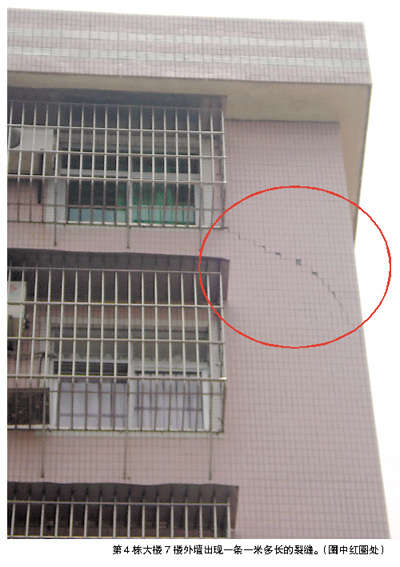 在住户的指引下,记者看到,位于第4栋大楼7楼外墙出现了一道一米多长的裂缝,据住户反映,近日紧挨大楼一工地施工挖地基,经过1个星期的施工,在大楼旁边挖出了一个长宽各20米、深近10米的大坑。昨天凌晨,支撑地基的木桩出现倒塌,泥土松散,对大楼地基造成影响,使第4、5栋大楼外内墙壁出现多处裂缝,以致出现安全隐患,有关部门接到通知后,紧急疏散大楼100多户居民,并对大楼安全进行检测。