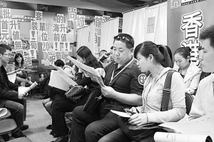 香港普通楼盘转手灵活,入市门槛相对较低,适合内地普通买家。图为近日内地投资客了解香港楼盘相关购买事宜。